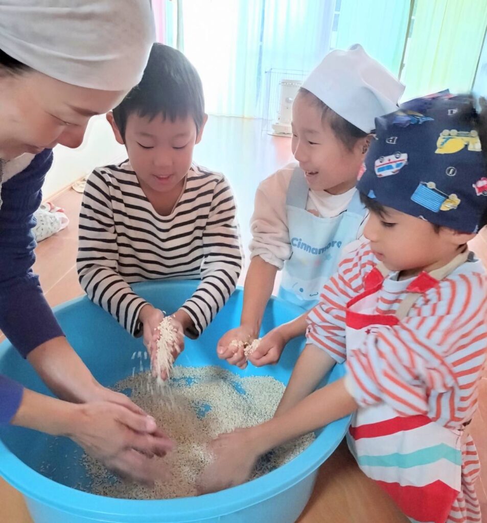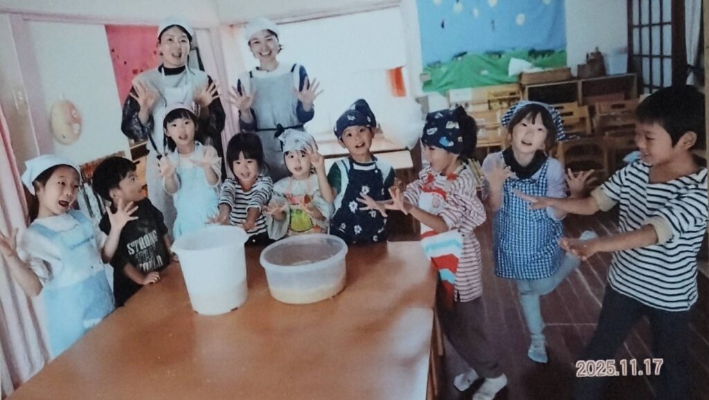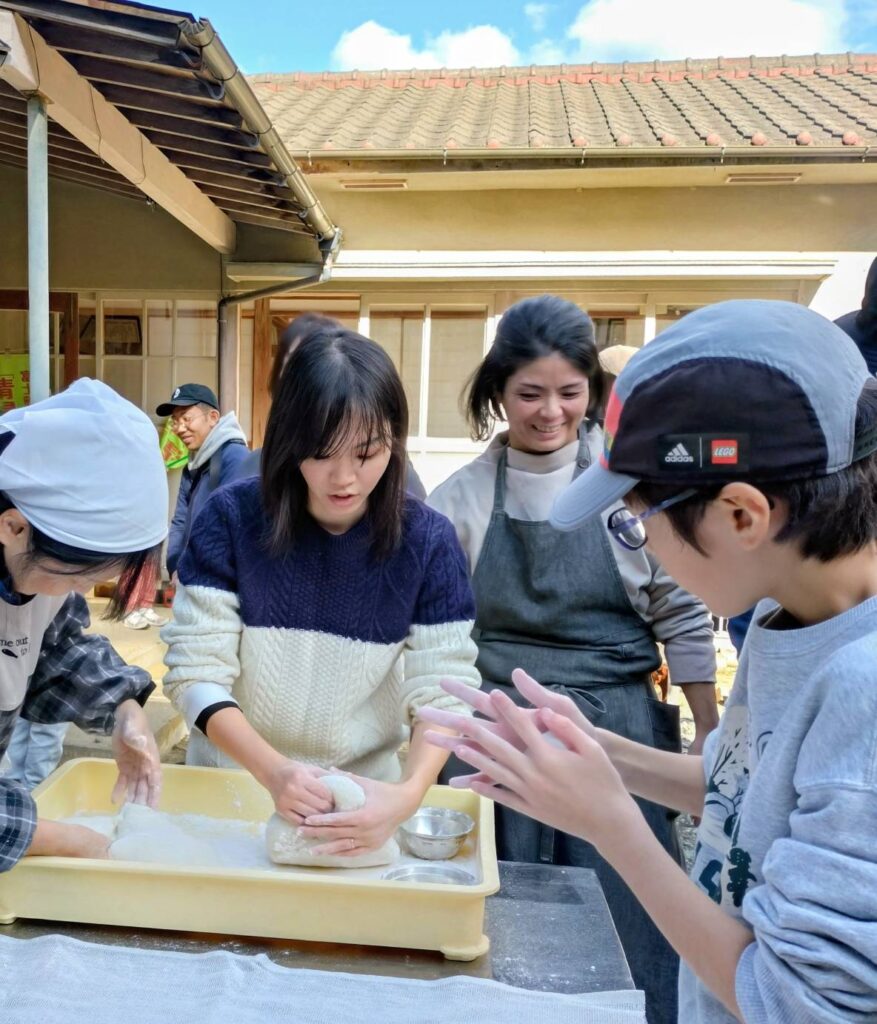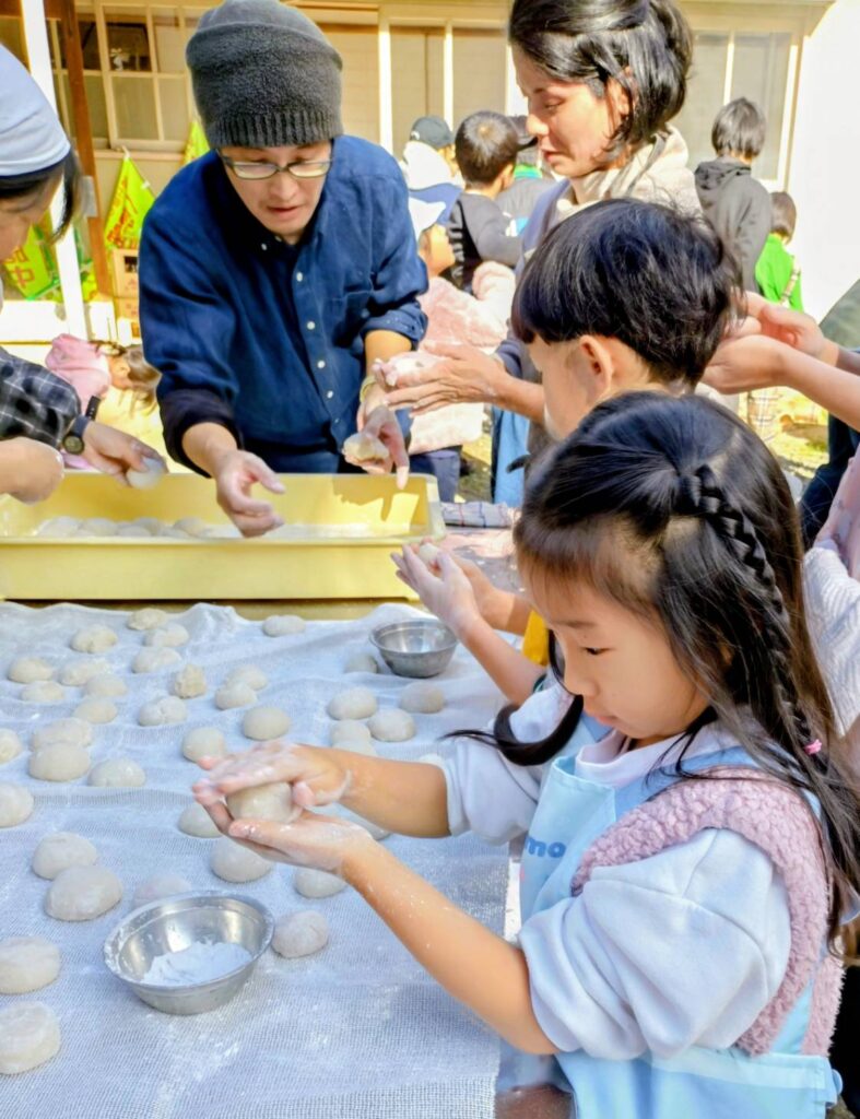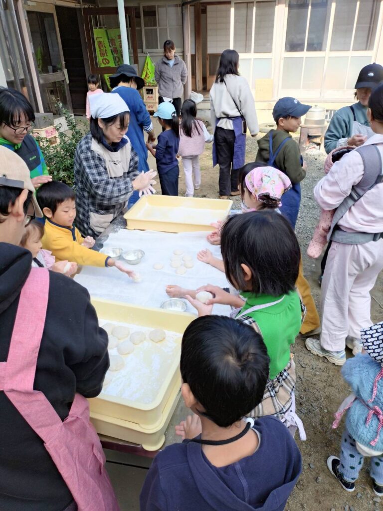 給食のおみそ汁になるおみそ作り。お母さんたちに手伝ってもらいながら、おみそを仕込みました。