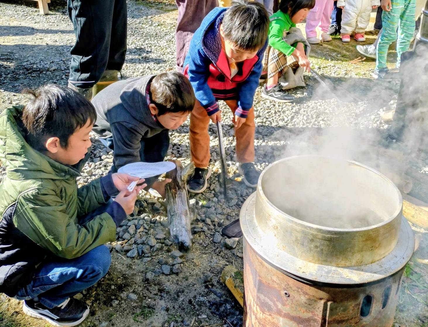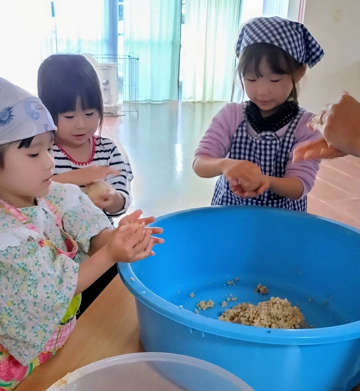 給食のおみそ汁になるおみそ作り。お母さんたちに手伝ってもらいながら、おみそを仕込みました。