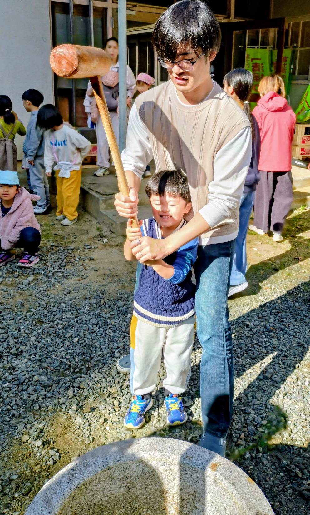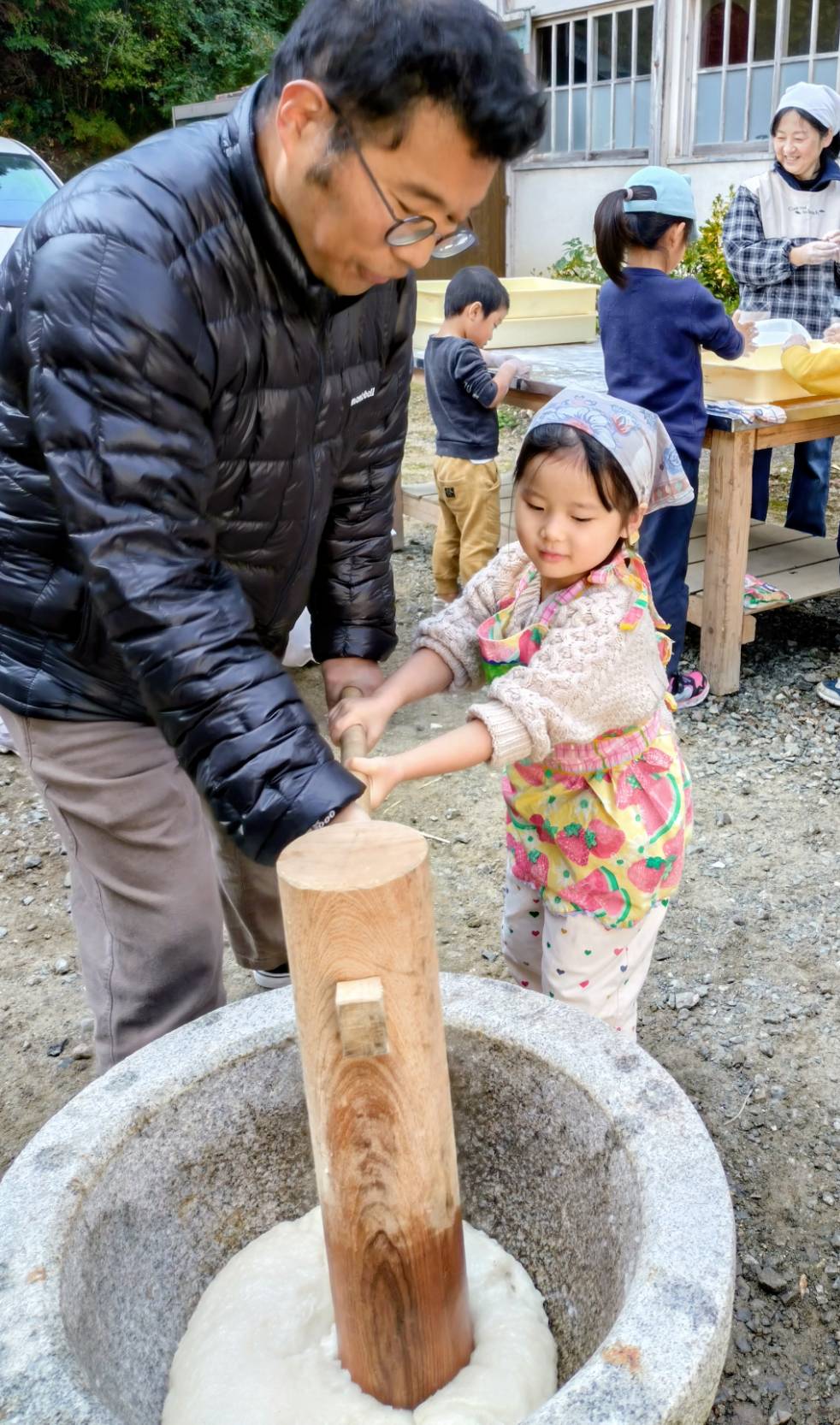 刈ったもち米をついて、おいしいおもちをたくさんいただきました。