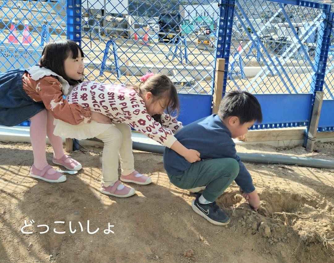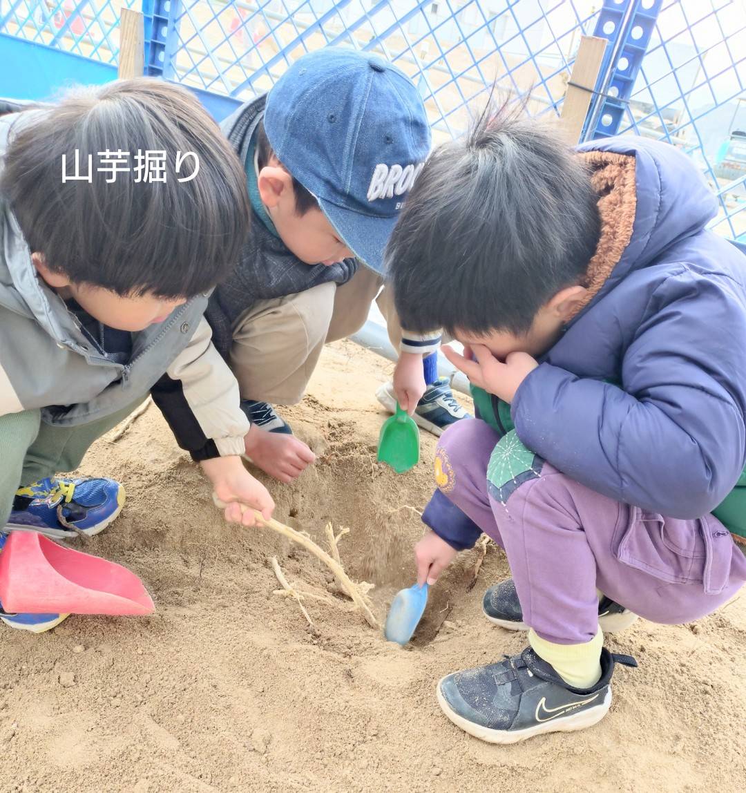 お庭を掘ったら、山芋が出てきてびっくり! そういえば、むかごがいっぱい落ちてたもんね、と子どもたち。