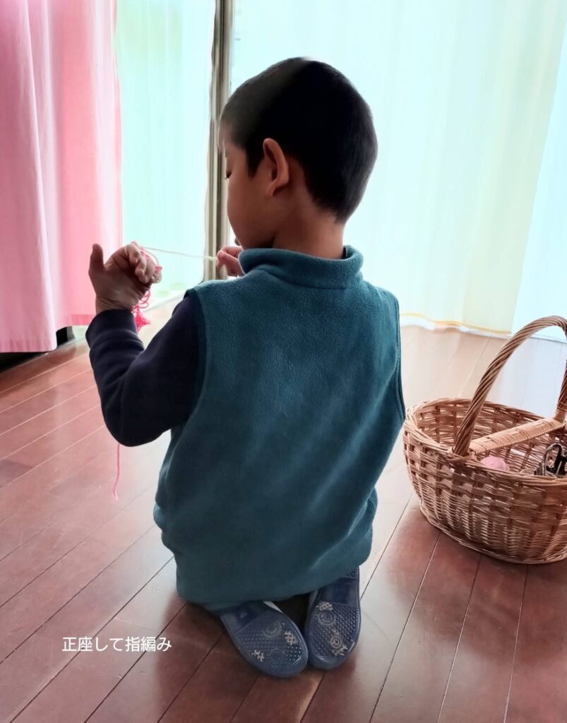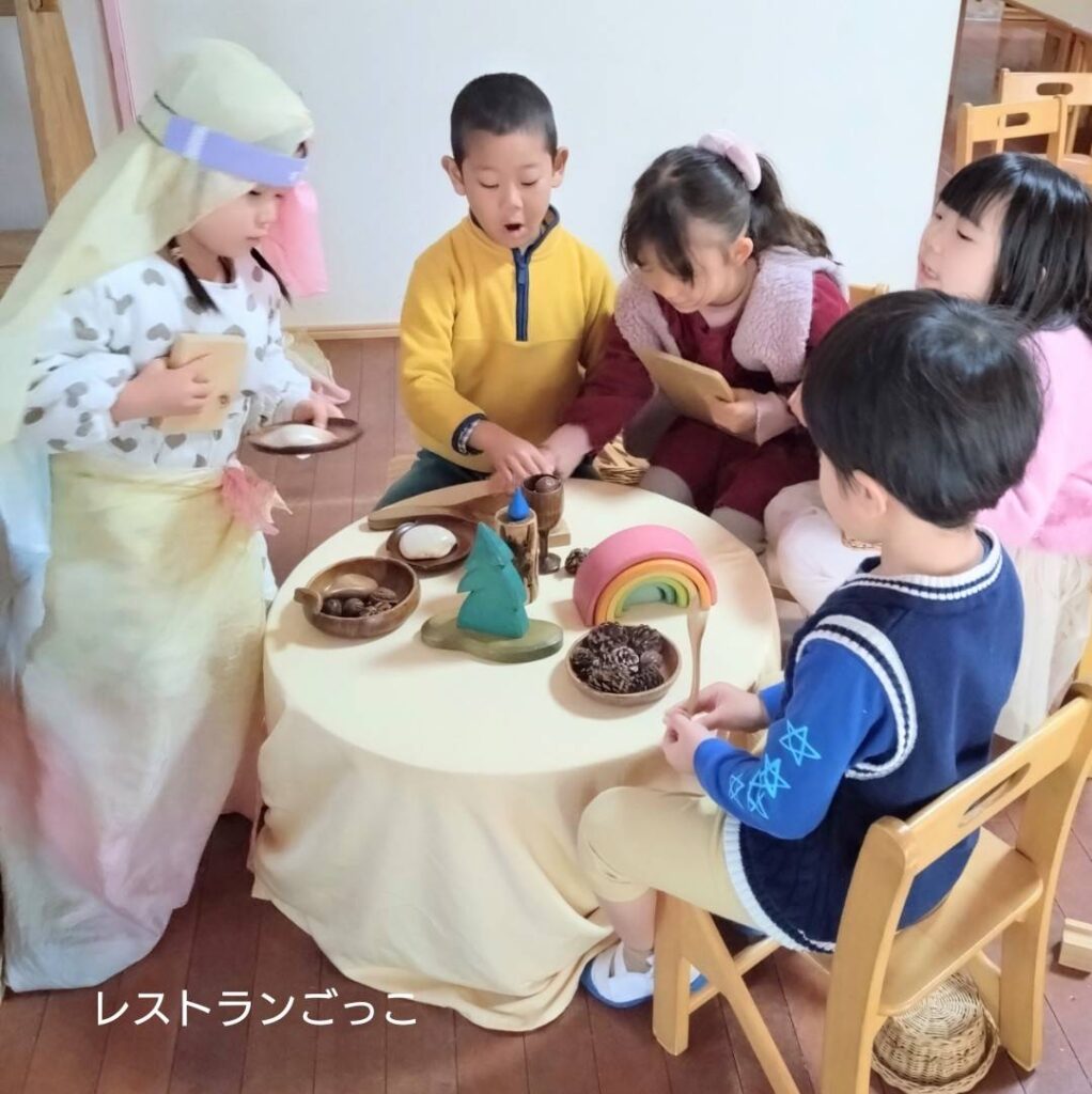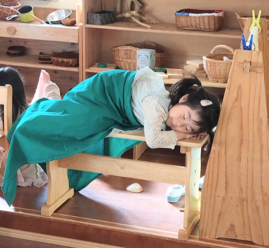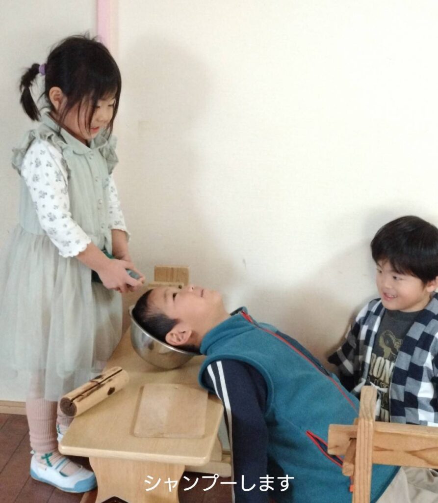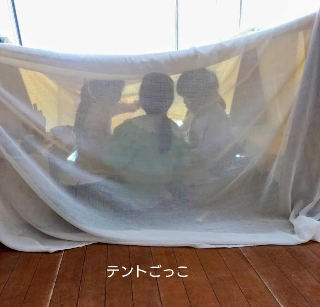おへやの中では、テントごっこ、編み物、レストランごっこに美容室ごっこ。