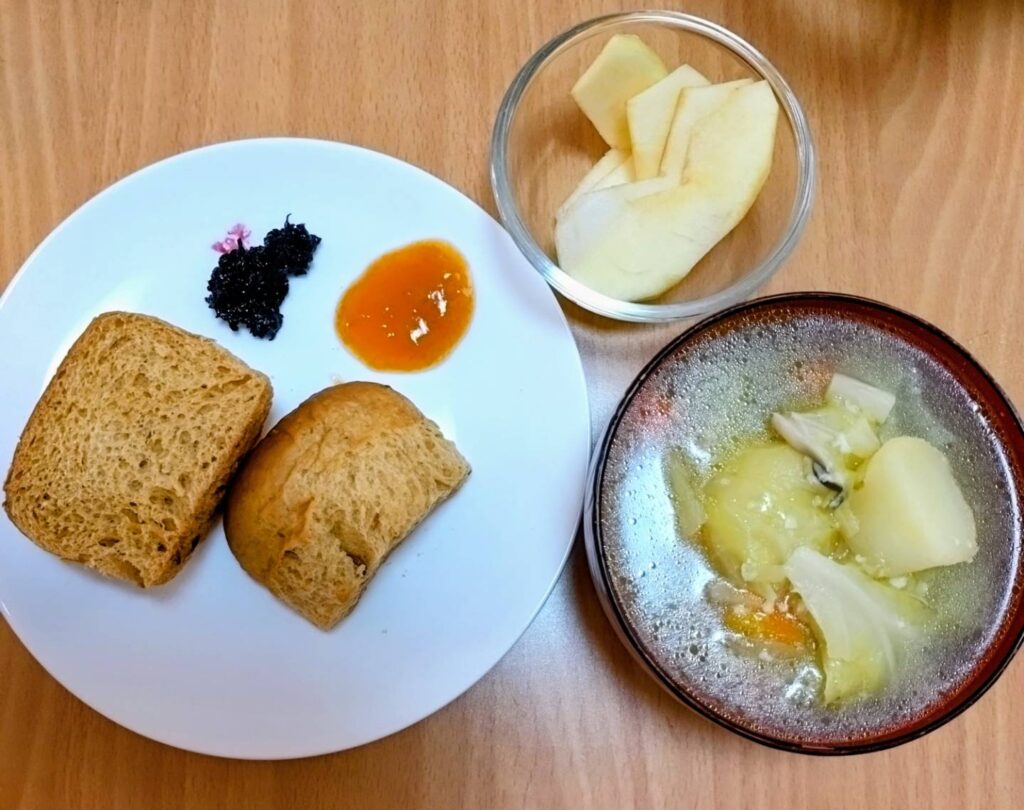 防災備蓄食のパンを焼いて、スープと手作りジャムを添えた給食もおいしかったね。